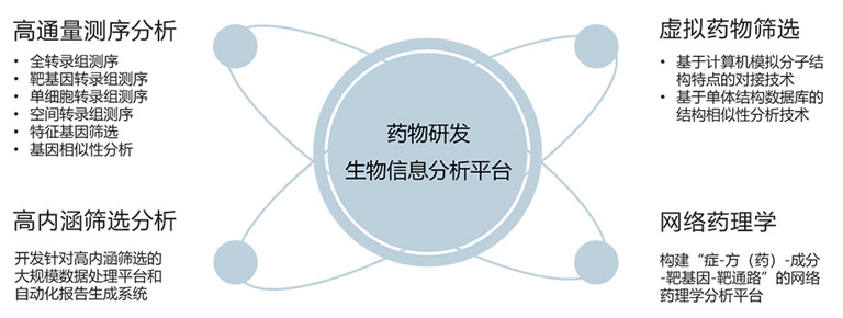 在新藥研發(fā)過程中,針對如何找到藥物作用靶點,建立了以闡明“癥-方(藥)-成分-靶基因-靶通路”為目標(biāo)的虛擬藥物篩選平臺和網(wǎng)絡(luò)藥理學(xué)分析平臺。包括基于計算機(jī)模擬分子結(jié)構(gòu)特點的對接技術(shù)和基于中藥成分結(jié)構(gòu)數(shù)據(jù)庫的結(jié)構(gòu)相似性分析技術(shù),以及涵蓋了PPI蛋白互作關(guān)聯(lián)、轉(zhuǎn)錄因子調(diào)控、靶基因預(yù)測等多方面的網(wǎng)絡(luò)藥理學(xué)分析平臺。此外,整合包括全轉(zhuǎn)錄組、靶向轉(zhuǎn)錄組、單細(xì)胞轉(zhuǎn)錄組、空間轉(zhuǎn)錄組在內(nèi)的不同轉(zhuǎn)錄組數(shù)據(jù)類型,搭建高通量轉(zhuǎn)錄組測序自動化分析平臺。